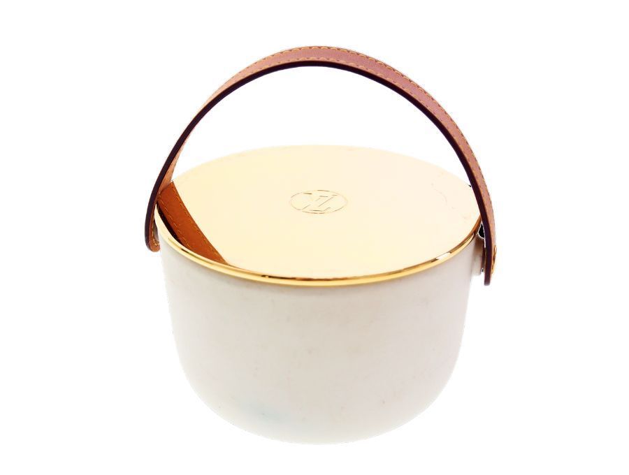 ルイヴィトンのアロマキャンドルです。ゴールドの蓋の中央にはLVのロゴが入っており、白の陶器製キャンドルカバーのセンターにはLOUIS VUITTONのロゴが刻まれ、ストラップにはレザーのヌメ革が取り付けられており高級感いっぱいのアロマキャンドルになります。数回使用されていて芯は黒くなっていますが蓋を開けただけでもほのかにアロマが香るので、お部屋に飾っておくだけでもとても素敵な空間になる事間違いなしです。