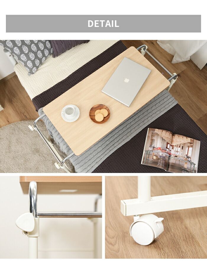 キャスター付きで移動もスムーズ。ベッドテーブルとしてだけでなく、スタンディングデスクや作業台としても使用可能です。
