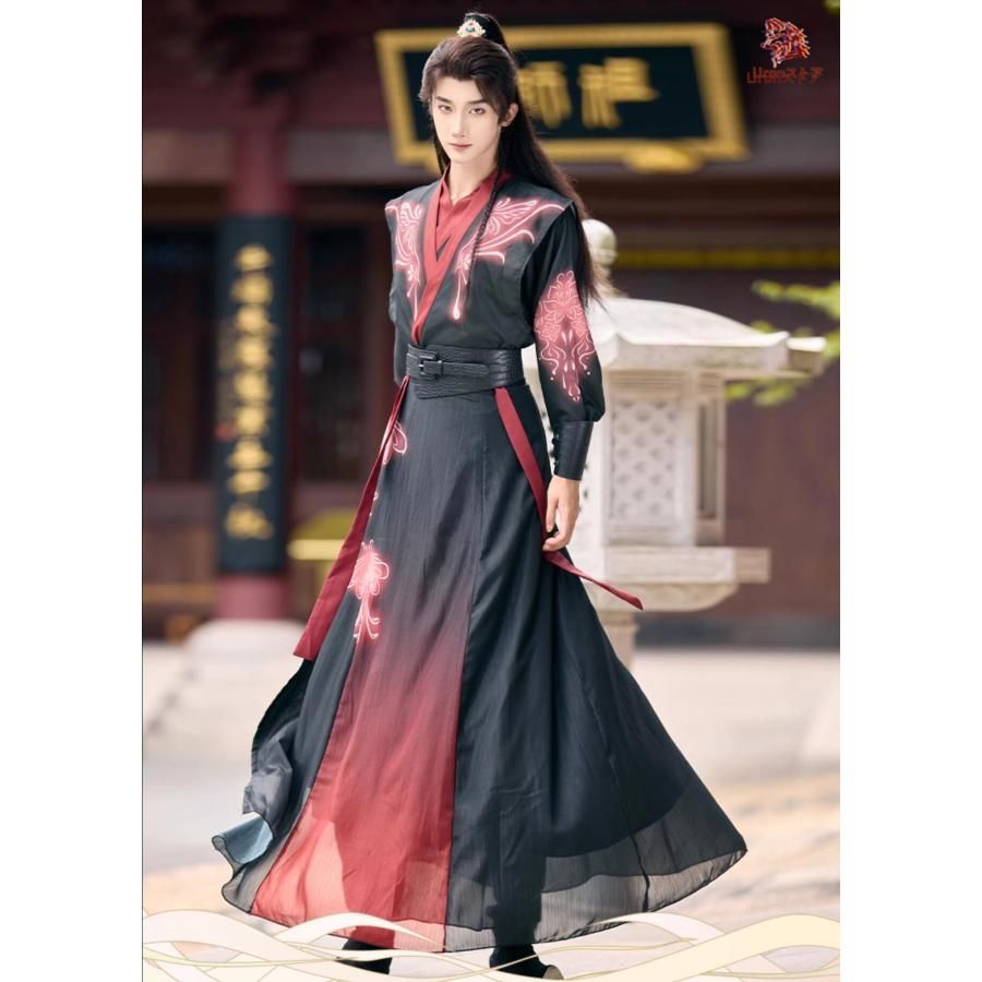 メンズ 漢服 5点セットアップ おしゃれ 暗黒 武侠風 チャイナ服 中国古代服装 男性 大人 ジュニア 蛍光感のプリント 黒に赤 緑 動きやすい