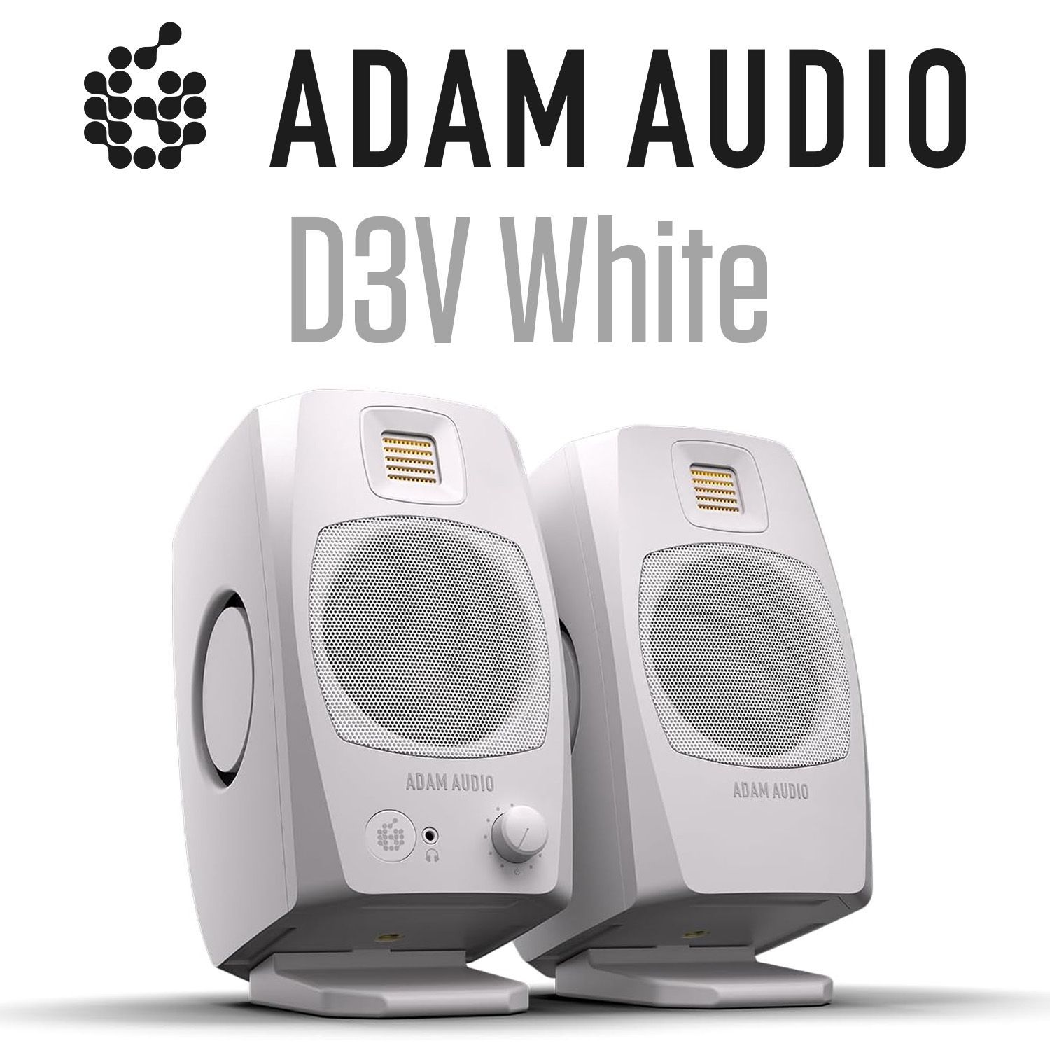 ホワイトカラーバージョンです。D3Vは、アーティスト、作曲家、コンテンツ・クリエーター、そして音楽ファンのために設計されており、ブラックとホワイトの2色から選べます。どんな環境にもマッチするコンパクトなデザインで、ADAM Audioの高品質な音楽再生をPCデスク上で手軽に楽しむことができます。
