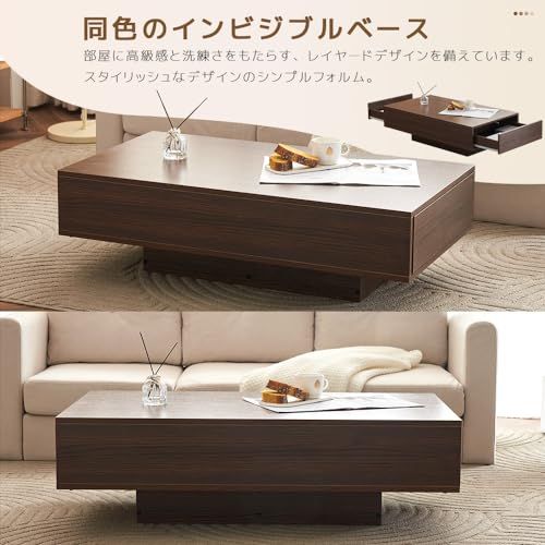 【収納力抜群の2杯の引き出し付き】 このテーブルは、広々とした収納スペースを備えており、周囲の環境を効果的に整理できます。天板の下に収納スペース備えているため、乱雑にならず、空間を最大限に活用することができます。家のスペースを節約できるだけでなく、家の中もきれいになります。一石二鳥ローテーブルです 【厳選されたMDF板】このセンターテーブルの本体はMDF繊維板で作られ、通常の板よりも耐久性と防水性に優れています。水や汚れに強いので、飲み物をこぼしてしまった時も簡単に拭き取ることができ、お手入れも簡単です。また、ぺん跡等によるキズもつきにくく、勉強やお仕事に気兼ねなくお使いいただけます! 【衝撃を減らす隠しデザイン】このローテーブルは、隠しスイッチ装置は一般的なスプリングより美しいと実用性を揃えており、静かで使用が可能です。スライドレール式で重量が増えてもストレスフリーに。隠しスイッチが装備されており、軽く押すだけで引き出しが出します。また、 【耐久性と安全性】環境に優しいMDF木材を使用した精密な設計により、優れた耐久性を備えています。無害で無臭の素材を使用し、安全性と家族の健康を確保します。最大100kgの荷重に耐えることができ、安定した使用体験を提供します。普段使いや特別な機会にも、このテーブルは信頼性のあるパートナーとして長年にわたりお供します 【多機能テーブル】この実用的な木製テーブルは小さなアパート、寮、寝室、その他の狭い部屋に最適です。コーヒーテーブルとしてだけでなく、応接テーブル、リビングテーブル、ダイニングテーブルや昇降式のパソコンテーブルとしても最適です! 【簡単組立】このコーヒーテーブルは面倒な組み立て不要、組み立てに必要な部品はすべて箱に入っており、日本語マニュアルも付属しますので、45分以内に完成でき、安心してご利用ください!