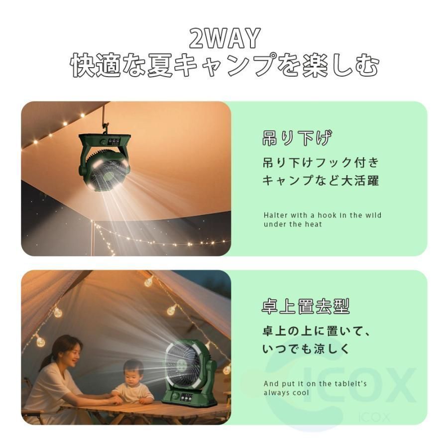 【新型ミスト扇風機&10L大容量水タンク】・従来のキャンプ用扇風機と比べ、新たにアップグレードしたミスト機能は、風を送りながら肌に涼しい微細な水霧を感じさせます。細かいミストが夏の高温環境で素早く蒸発し、お肌に涼しさをもたらします。充電式ポータブルファンには大容量10L水タンクを装備。満水時には5?9時間の長時間使用が可能で、頻繁な水補給の必要がありません。使用しない時は本体を折りたたんでバッグ内に収納可能。コンパクトにまとまるため、アウトドア旅行にも直接持ち運びに便利です。