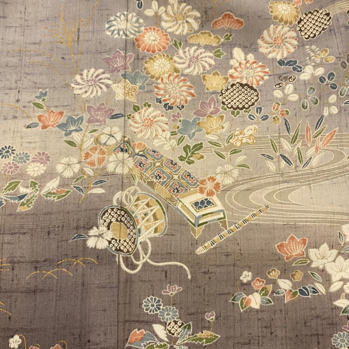 訪問着 身丈154.5 cm 裄丈63 S 袷 紬地 和楽器 秋草 金彩 茶紫 正絹