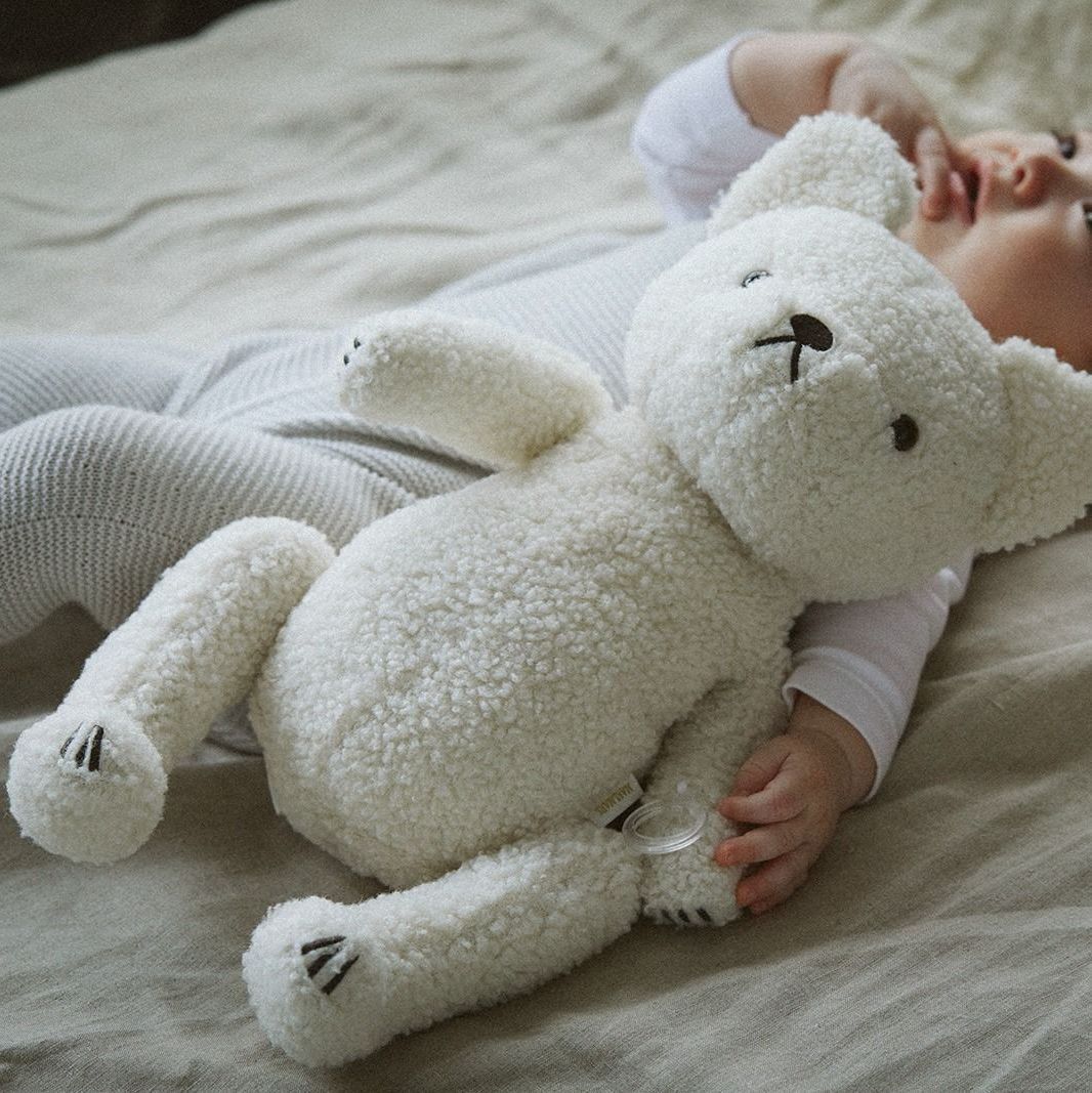 ベビー期には肩紐を外してお話し相手になるぬいぐるみに。歩けるようになったら肩紐を付けて、リュックとしてお出かけのお供に。よちよち歩きの転倒時には、クッションの役割も果たします。中綿を取り出して、おやつやおもちゃを収納しても。