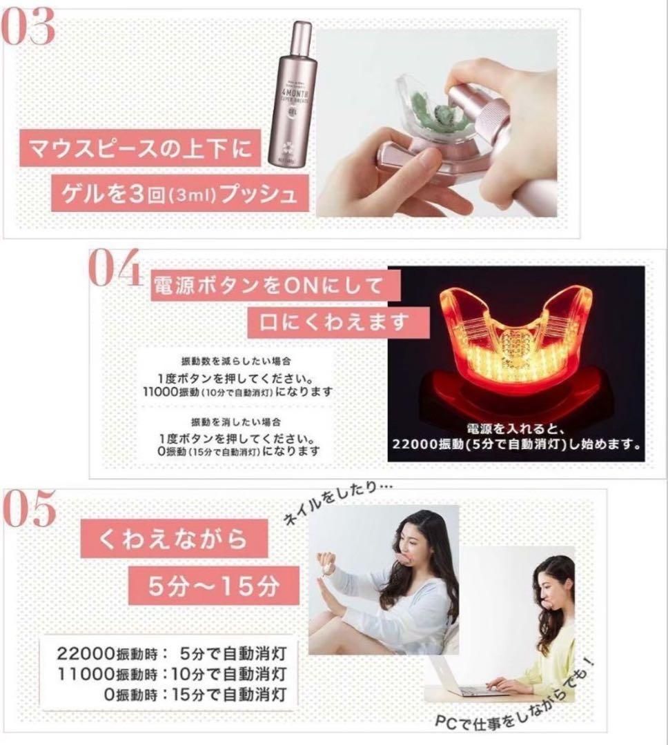 ・主な特徴:口内をLED照射するパノラマ設計(舌20灯・歯茎80灯)、高周波振動、軽量マスク型(約68g)、オゾン水うがい対応 等