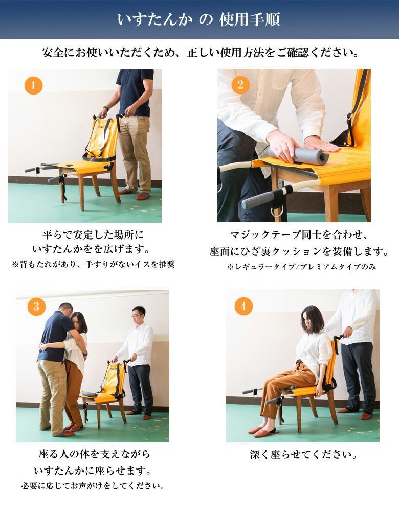 いすたんかは事故・災害時の避難や、救急時の搬送のほか、日常の介護の場面でもお使いいただけます。