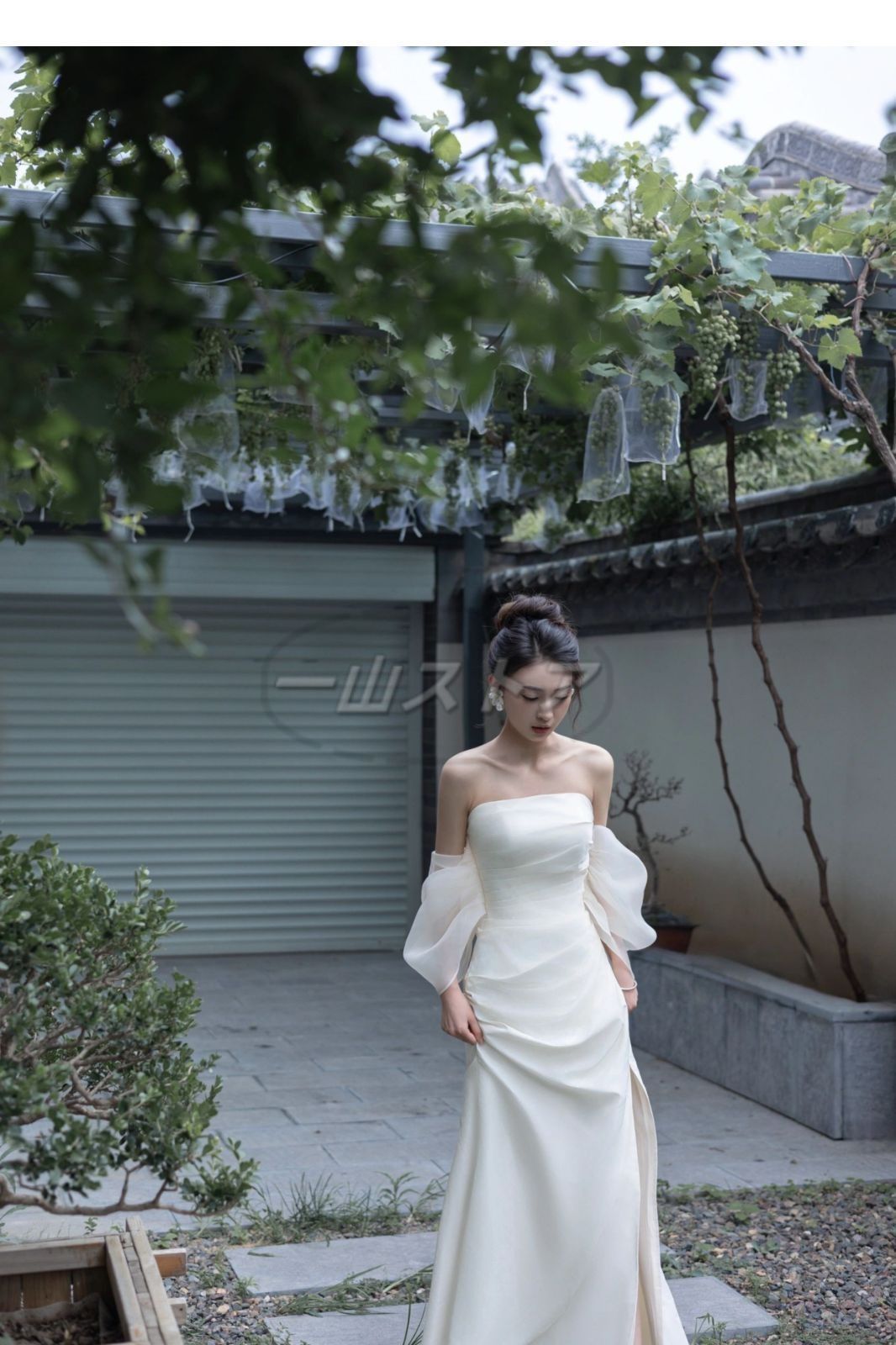 デザイン: 抹胸(ビスチェ)スタイル、オフショルダー、泡袖(取り外し可能)