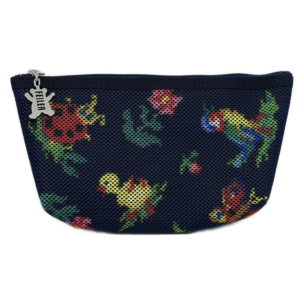FEILER フェイラー ポーチ - ネイビー×イエロー×マルチ メッシュ てんとう虫 鳥 バタフライ 蝶 フラワー 花 ひよこ