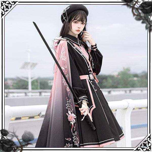 ミニロリ 軍服ロリータ ゴスロリ フルセット ワンピース 長袖あり 肩章 桜柄 大正風 ペリースマント 片掛全掛マント ミリタリーロリィタ ブラック