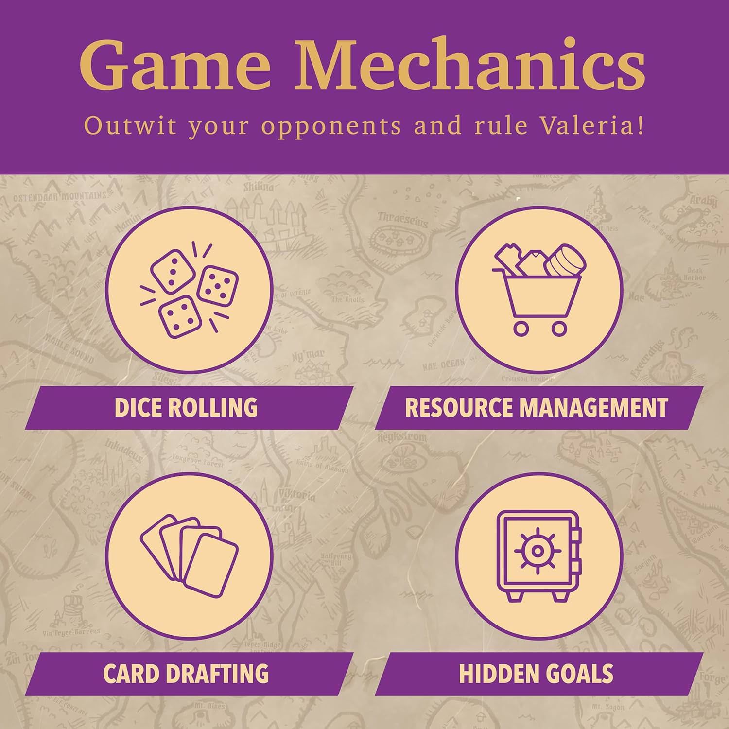 また、ゲームごとに使用されるカードの組み合わせが変わるため、何度でも繰り返し遊べる高いリプレイ性も大きな魅力です。同じ戦略が必ずしも通用しないため、毎回新鮮な気持ちでプレイできます。最終的に最も多くの勝利点を獲得したプレイヤーが、新たなヴァレリアの統治者として勝利を収めることになります。