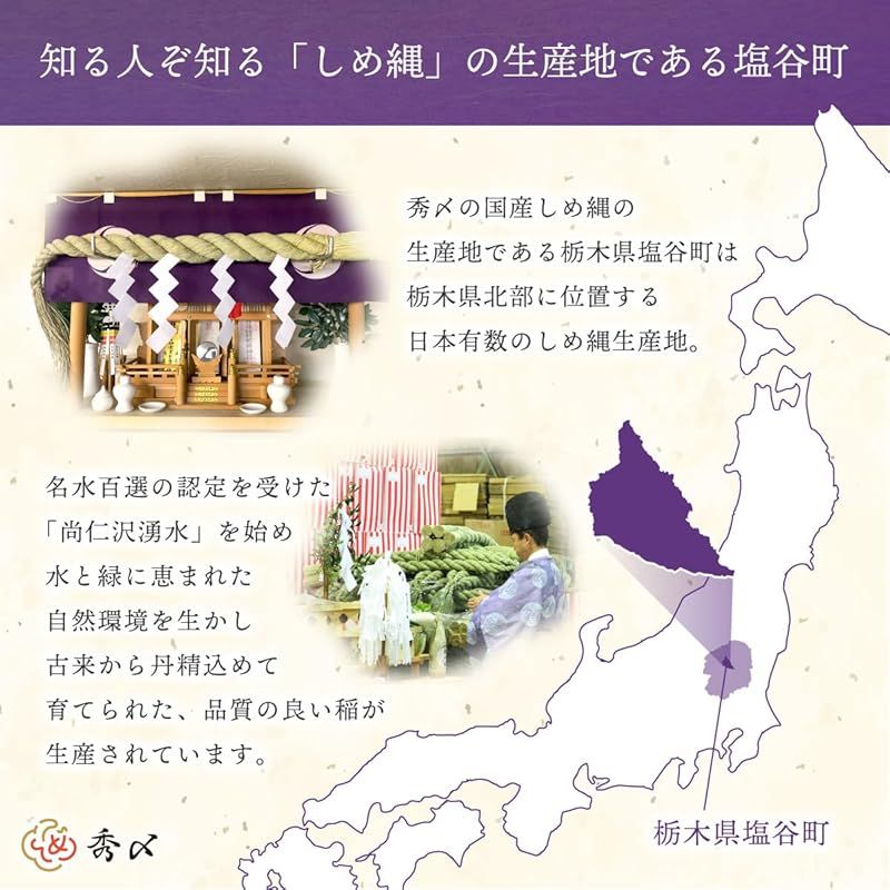しめ縄の産地として50年以上の歴史がある栃木県塩谷町で製作したしめ縄です。北関東の北部にあるこの土地では名水百選の認定を受けた「尚仁沢湧水」をはじめ水と緑に恵まれた稲作に適した環境でしめ縄専用に育てられた品質のいい青わらを使用しており、塩谷町の特産品となっております。