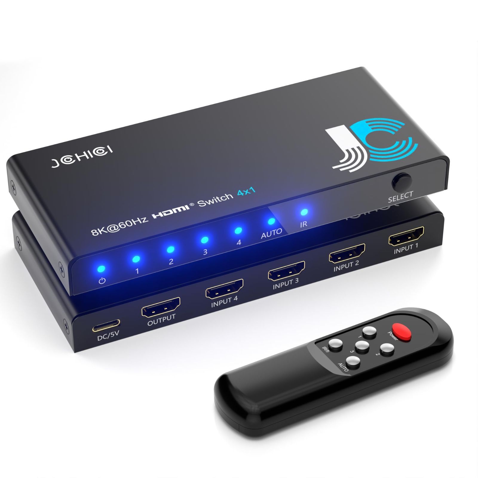 「8K安定版」JCHICI HDMI切り替え器 4入力1出力 8K@60Hz/4K@120Hz/1080P@240Hz HDMI2.1切替器 セレクター リモコン付き HDCP 2.3/HDMI 2.1 HDR 3D対応 選べる自動・手動切替機能 【PS3/PS4/PS5/Switch2動作確認済み】全ポートCEC対応 日本語説明書と電源プラグが付属しています