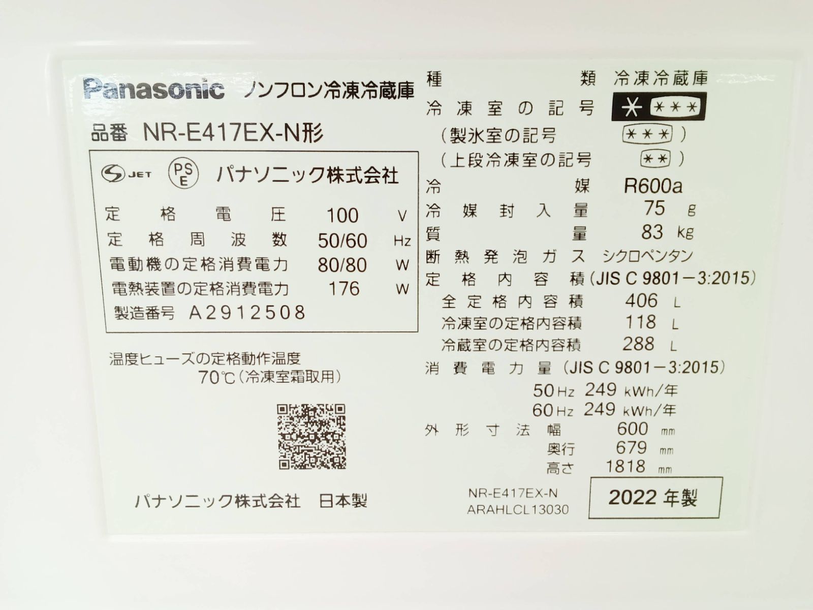 関東地域 販売 Panasonic 冷凍庫 製 406 L NR-E 417 EX-N H 461