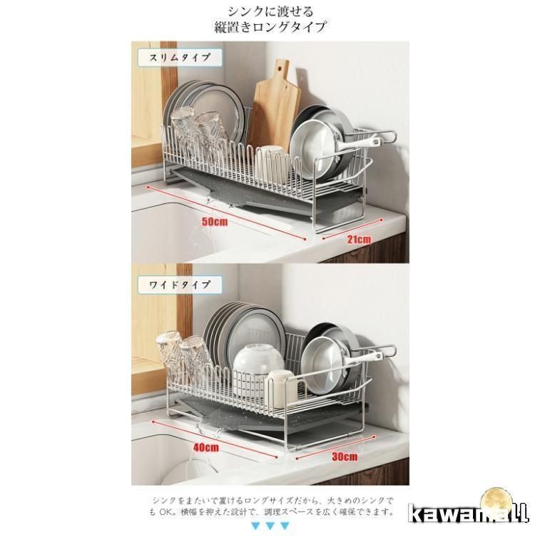 水切り 水切りラック 水切りかご スリム おしゃれ 大容量 包丁立て 箸置き まな板立て 高さ18cm 幅50cm 奥行21cm 水を自動で流すトレー付き 細長い 狭い 省スペース シンク横 キッチンラック 一人暮らし 新生活 食器 乾燥 組み立て簡単 水切りカゴ