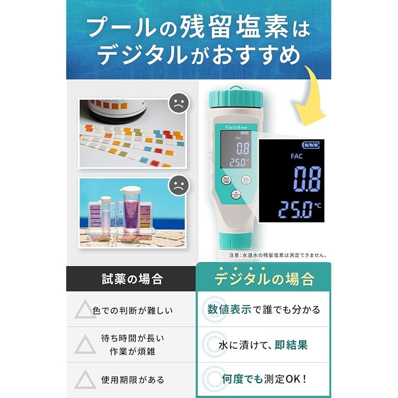 Field ブランド 7 in 1 残留塩素 水質測定器 塩素 PH EC TDS 塩分 ORP 温度 品質検査済 書付 防水 高精度 自動校正 動画解説 日本語マニュアル 校正液付 FAC 遊離残留塩素 プール 消毒液