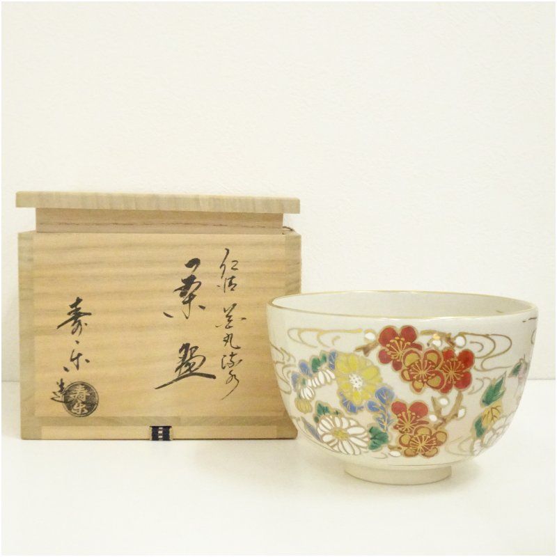 京焼 川添寿楽造 仁清花丸流水茶碗 共箱 茶道 抹茶 おしゃれ 抹茶茶碗 抹茶碗 和食器 レトロ 茶器 骨董 茶わん 茶会 茶の湯