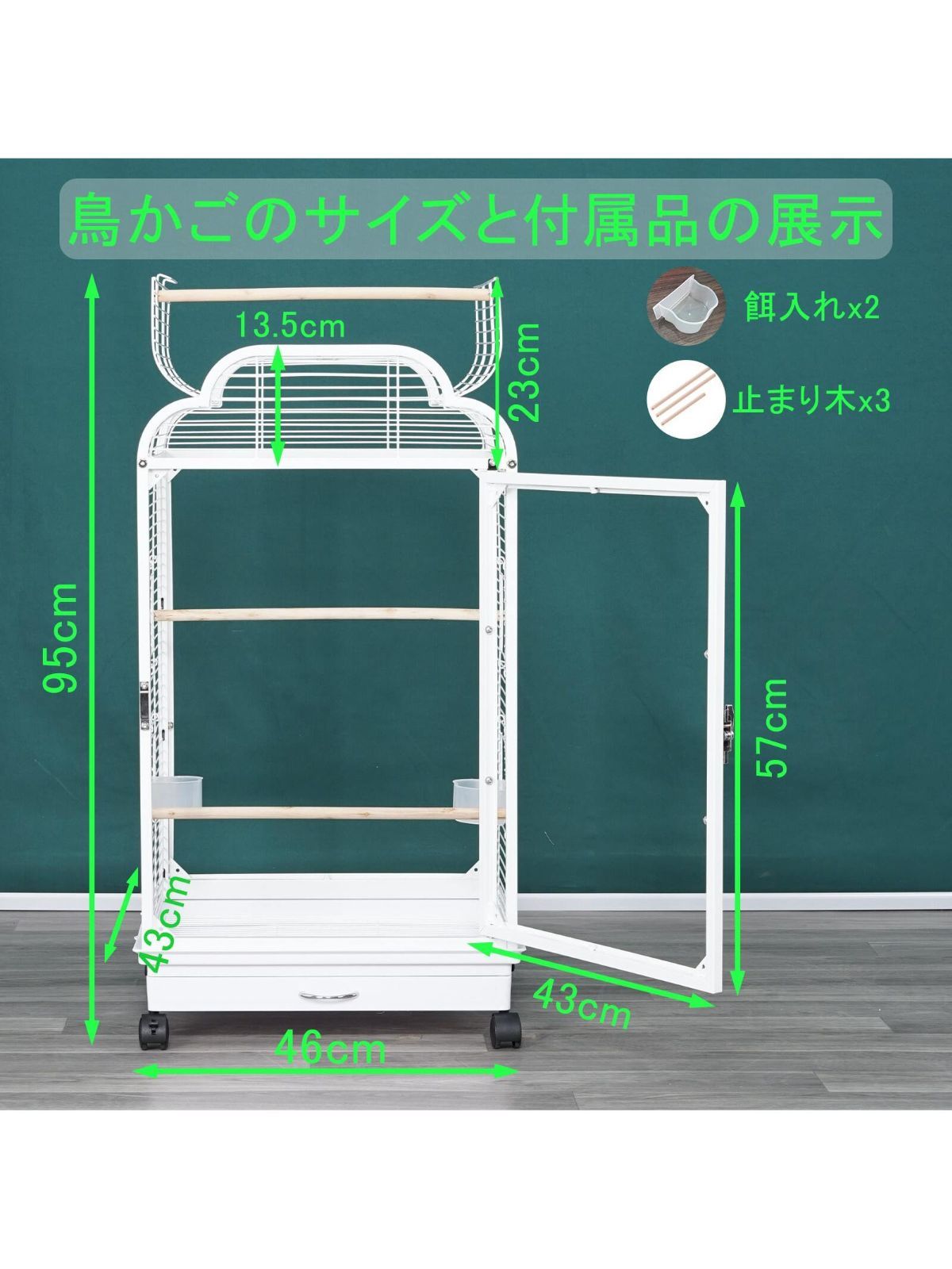 セット内容:ケージ本体、止まり木×3、エサ入れ×2、引き出し式トレイ×1
