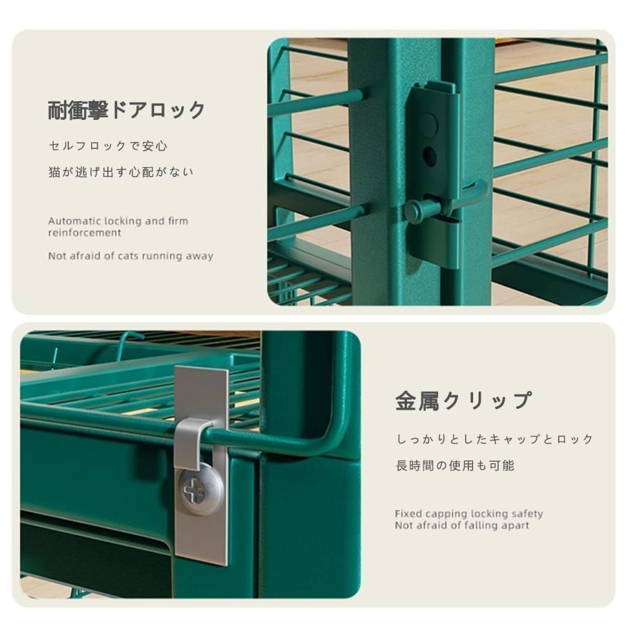 底面が緻密で足を挟まない:底面の金網が緻密で猫の足先を挟まないので、ケージ内の移動が容易です。 ロック機能付きユニバーサルホイールを装備し、家庭内での移動と固定が容易です。