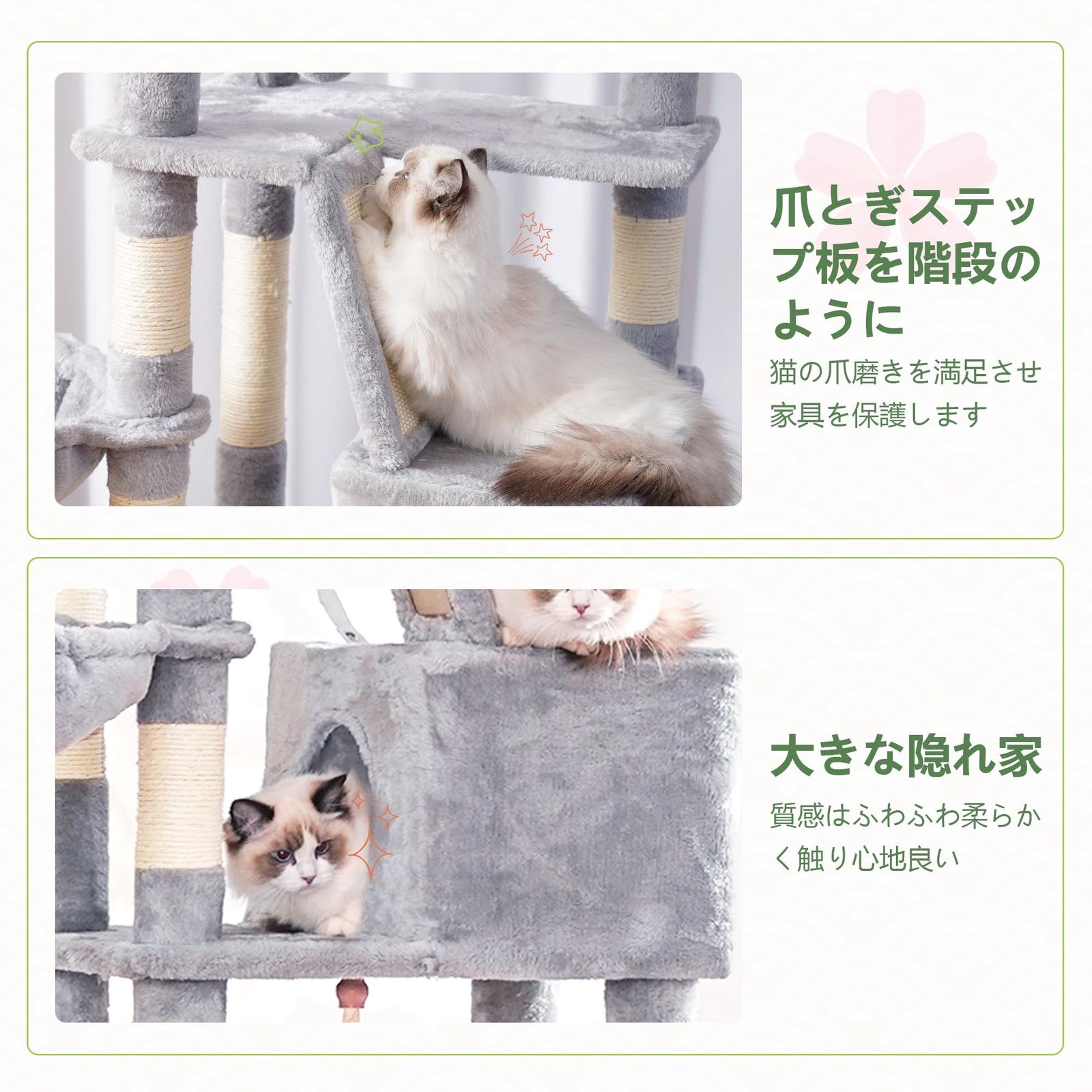 【安定性】厚みのある底板と、転倒防止装置を併用しており、キャットツリー全体が安定しています。2本の柱で支えられている見晴らし台は、1本の柱で支えられている猫用ベッドよりも安定性が高まります。