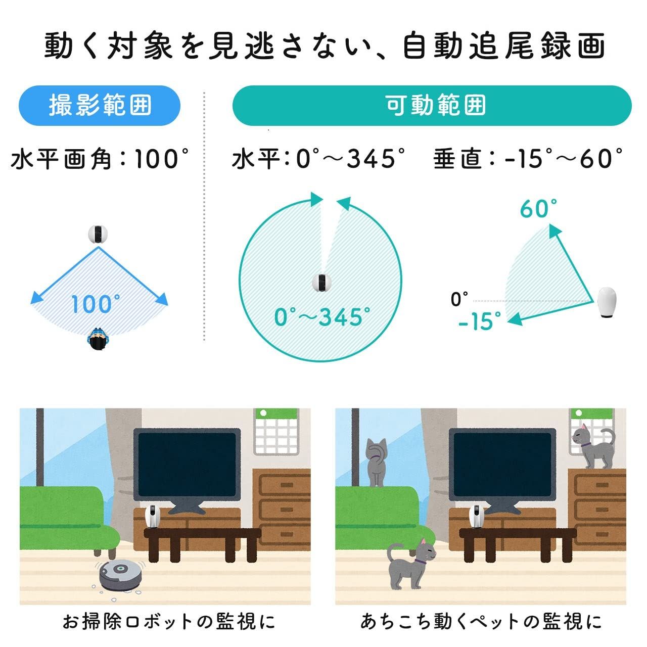 の映像が見えます。複数台のカメラを接続して、アプリ上で映像をまとめて表示させることも可能です。自動追尾機能搭載で、画角内に入っている動く対象物に対して自動で向きを変えることができます。解像度1920×1080のフルHD画質で鮮明な映像で確認できます。赤外線ナイトビジョンモードを搭載で暗い場所や夜中でも鮮明に撮影できます。動体検知や音声検知機能付きで、検知するとスマートフォンに通知が届きます。■保証期間:ご購入日より6ヶ月
