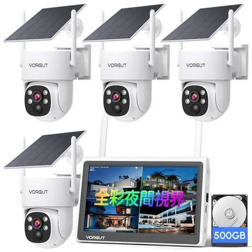 全彩夜間撮影 5年保証 VORGUT防犯カメラ屋外ソーラーモニター付き4台セット低照度監視カメラワイヤレス電源不要工事不要360°監視人体検知パンチルト駐車場車上荒らし盗難 空