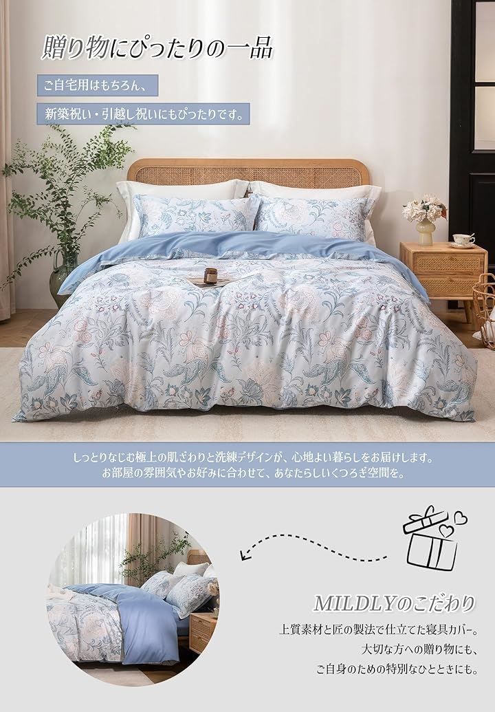 「デザイン性で変わる寝室空間」 MILDLYデザイナーチーム開発のオリジナル花柄が、寝室をベッドカバー おしゃれな空間に進化させます。