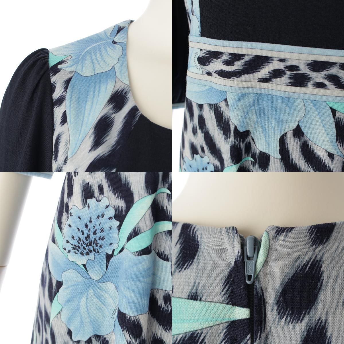 レオナール ウール フラワー 花柄 レオパード バックジップ ワンピース ドレス 0340906 ブルー ネイビー 38