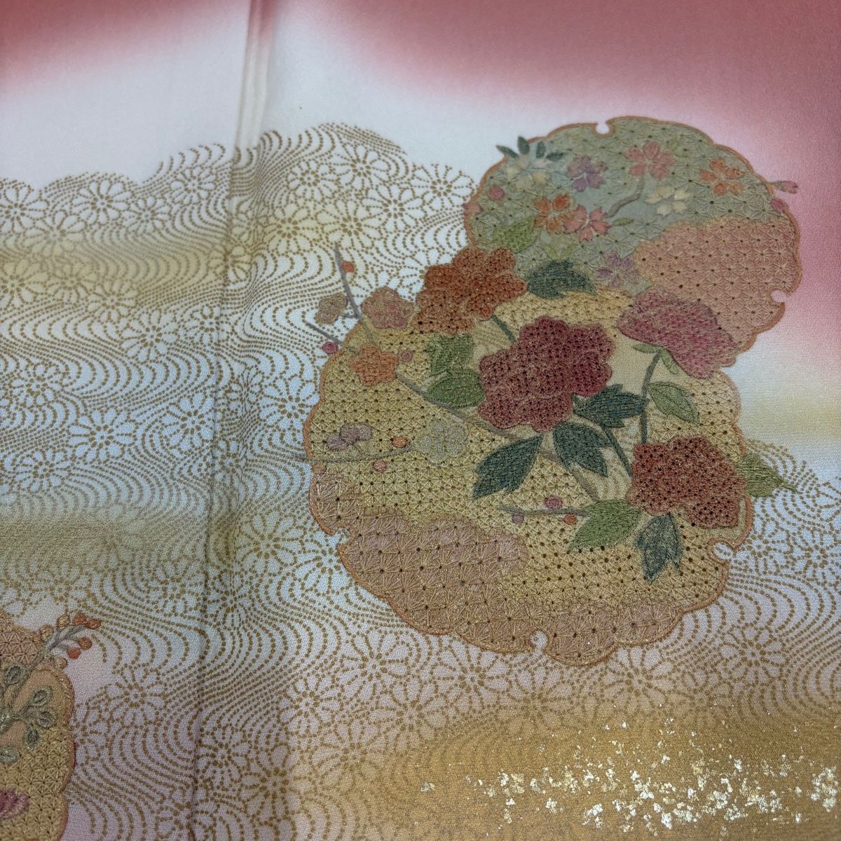 訪問着 身丈158 cm 裄丈64 M 袷 雪輪 草花 刺繍 金彩 ピンクベージュ 正絹 秀品