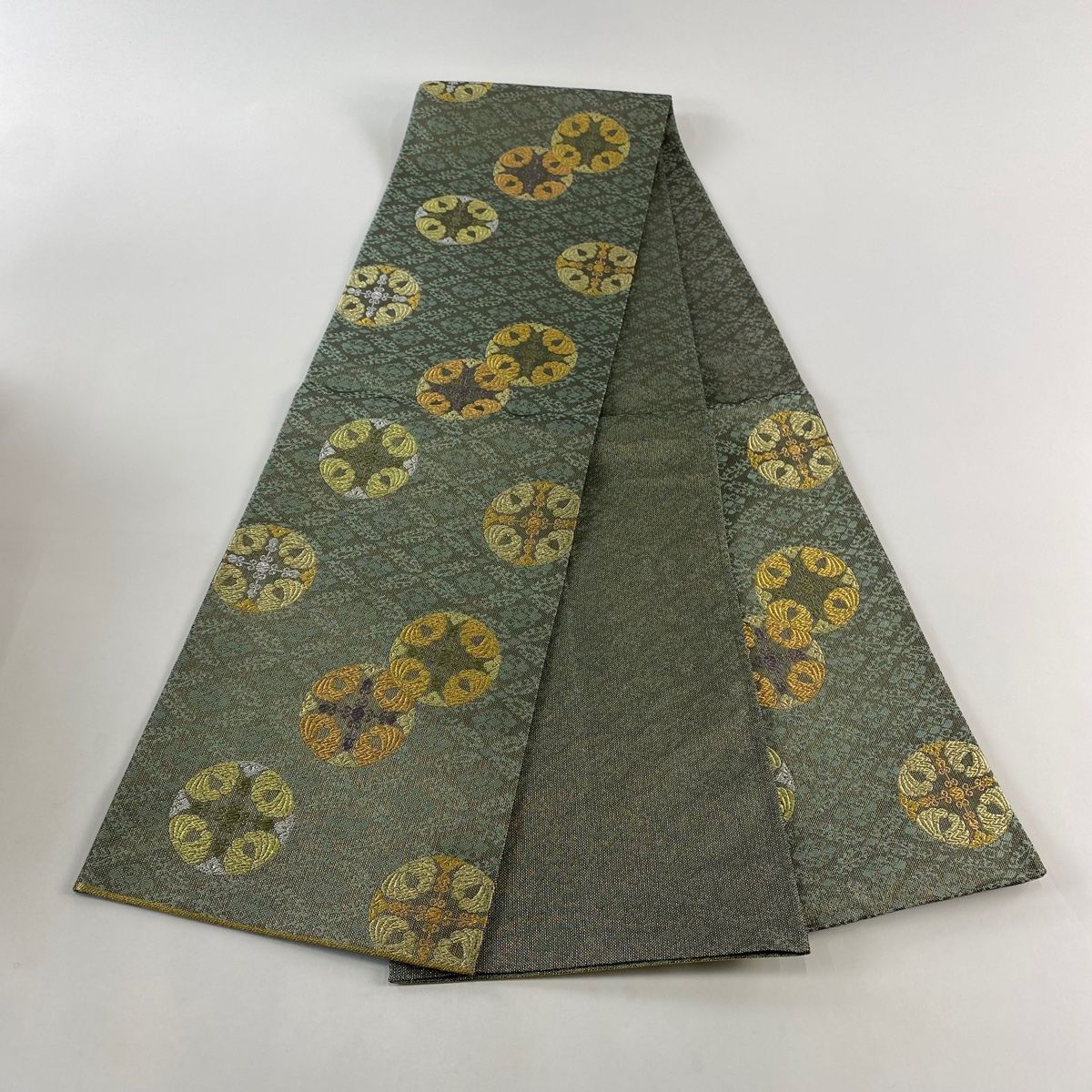 袋帯 秀品 華文 金銀糸 刺繍 灰緑 六通 正絹