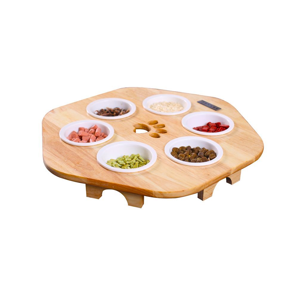 猫用 フードボウル エサ入れ 天然木 無垢材 猫 犬 餌皿 餌台 セラミックボウル 食器台 多頭飼育 セット 6連