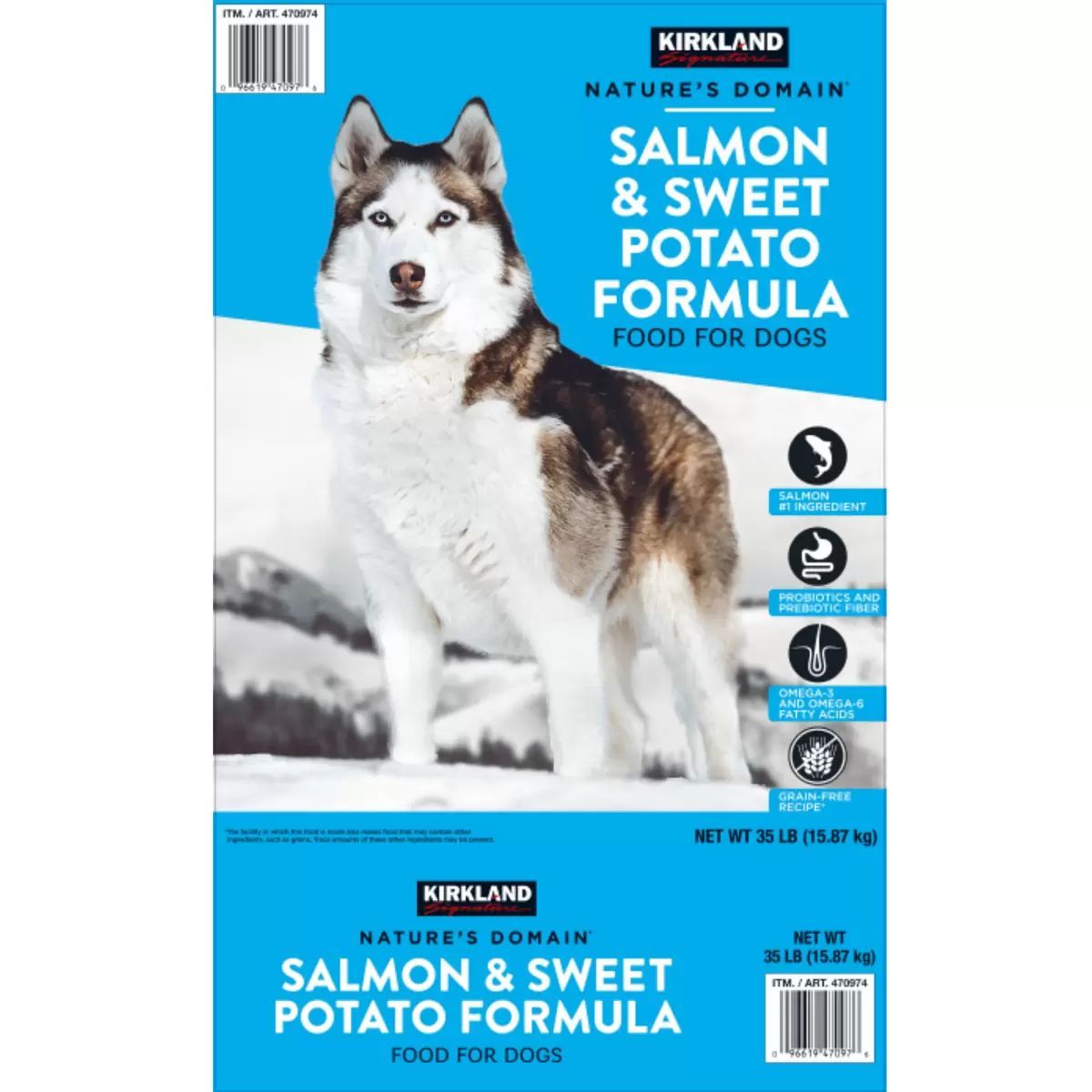 カークランドシグネチャーの成犬・子犬用サーモン、ポテトは良質なたんぱく質、オメガ脂肪酸が含まれており、健康的な生活をサポートします。