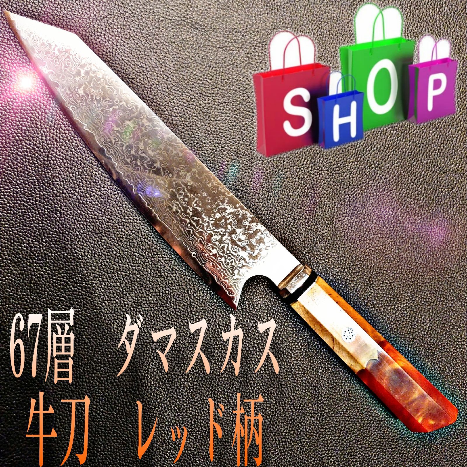 V金10号 67層 ダマスカス包丁 レッド柄 剣型 牛刀 三徳