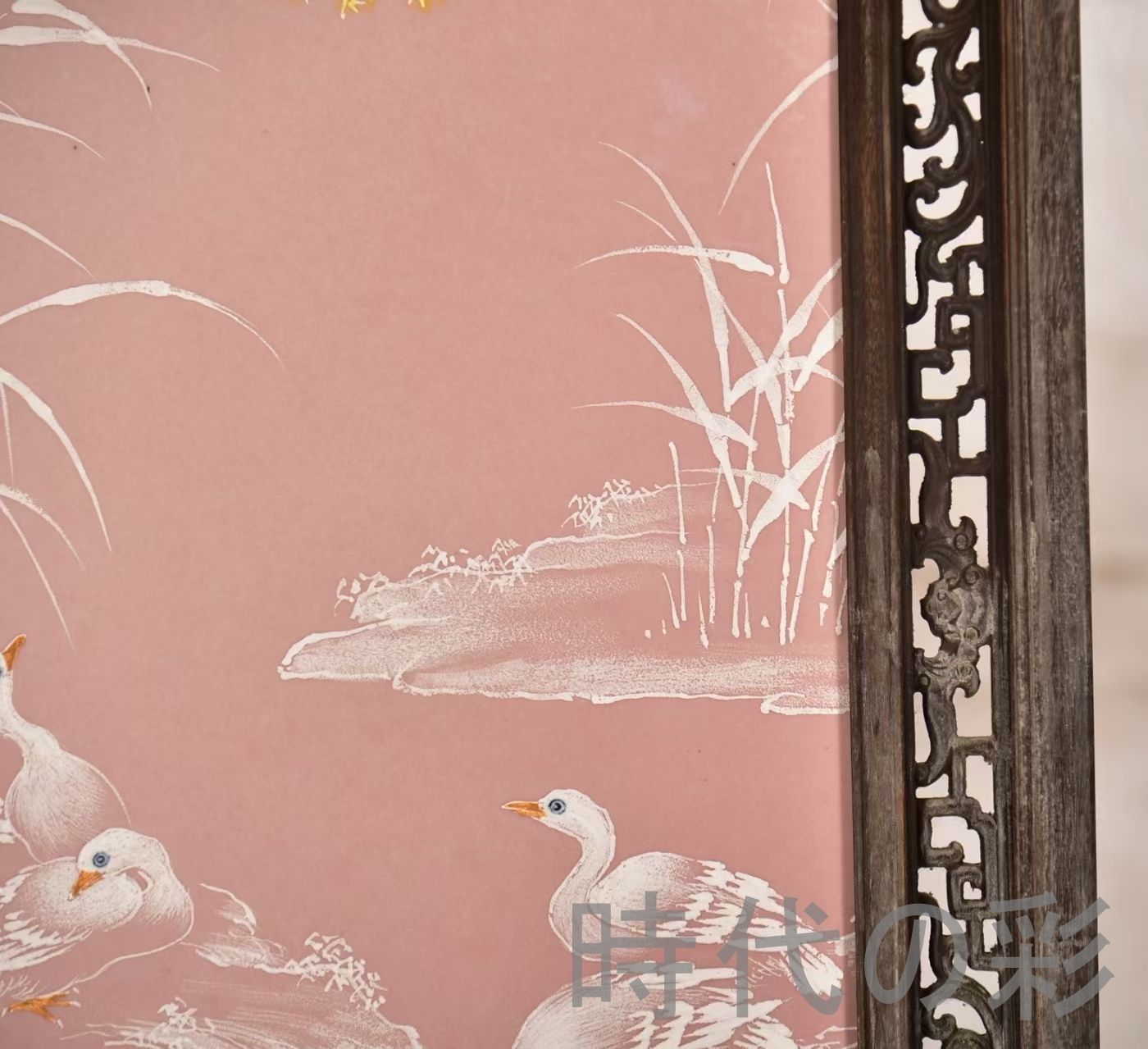 青花大王・王歩による桃紅磁板画。紅木透かし彫り枠の優雅な造りで、中堂掛屏や高級インテリアにも最適です。