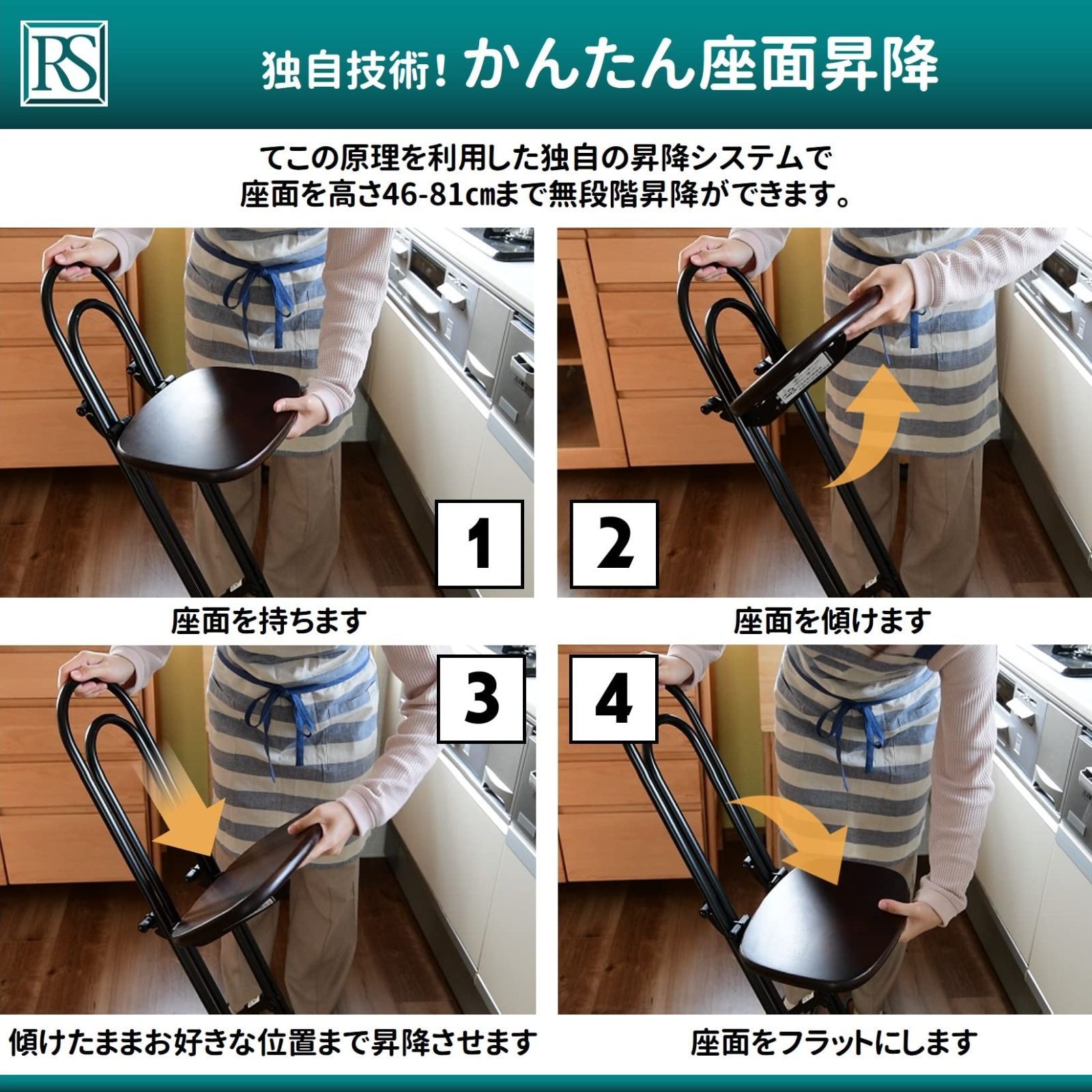 【座面の高さが無段階で調節できる】ルネセイコウ独自のスライド方式で、座面の高さを46-81㎝まで無段階で調節ができる折りたたみチェアです。工具いらずでカンタンに調節ができるので、1台あればデスクワークやキッチンでの使用など様々な場面で活躍します。※2024年2月頃より改良版へ順次モデルチェンジします。本体フレームの背面全体にディンプル加工を施すことで、座面がズレ落ちにくくなりました。
