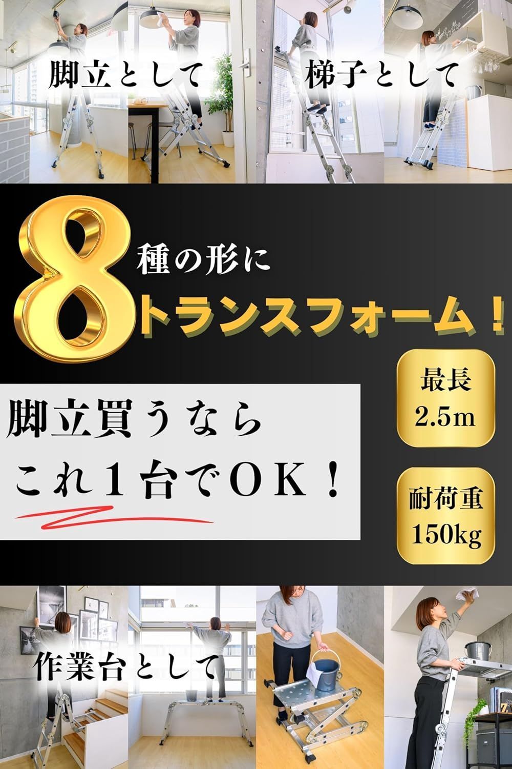 ●ハシゴ、脚立、作業台、足場、階段での作業まで8変化しオールマイティに活躍。