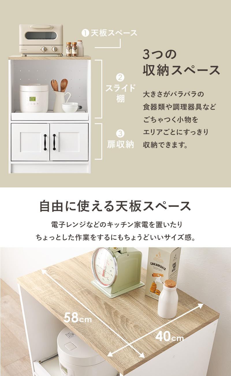 スライド棚が付いたキッチンラック幅58cmタイプは、スライド棚収納と扉収納に分かれています。
