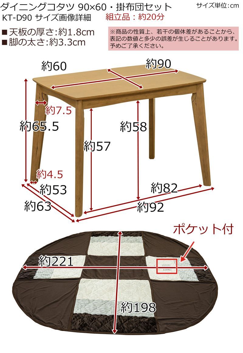 こたつテーブル セット ダイニングコタツ リビングコタツ こたつ布団 薄掛け 90センチ幅 長方形 510 W 510ワット ナチュラル NA 佐200 KT-D 90 3.4 掛布団セット