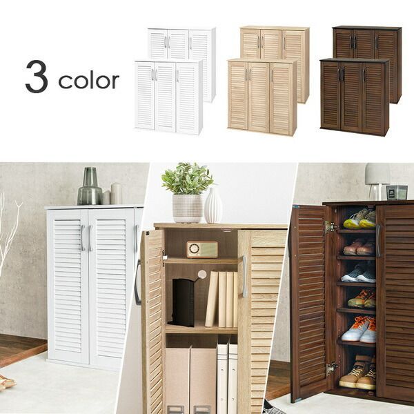 通気性が良いルーバー扉と背面の通気口で湿気や臭いがこもりにくいシューズラック。連結金具付きで縦にも横にも連結可能、大量収納可能な2点セット