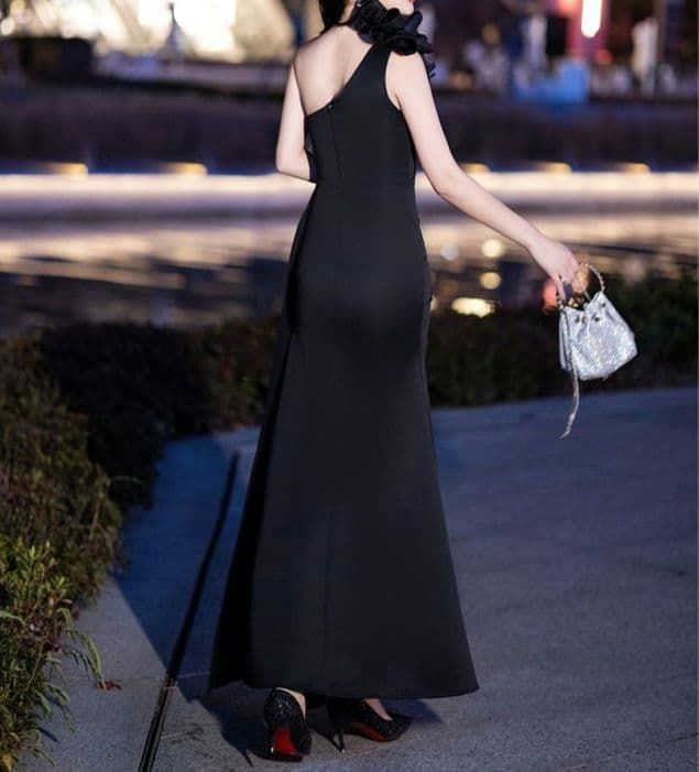 大胆スリットとワンショルダーが魅力のセクシーブラックドレス