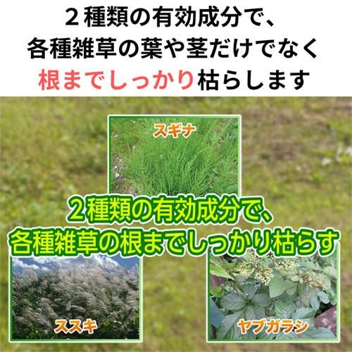 2種類の有効成分で、スギナ・ススキ・ヤブガラシなど各種雑草の葉や茎だけでなく根までスッキリ枯らします。