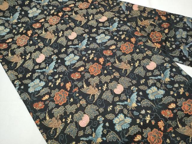 平和屋着物 全通柄 九寸名古屋帯 唐織 花鳥文 黒地 正絹 hy