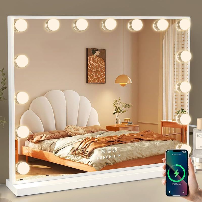 商品名:FENCHILIN 化粧鏡 女優ミラー ハリウッドミラー 壁掛け/卓上両用 USBポート付き 三色照明モード 無段階調光 15個LED電球付き 10倍拡大鏡付き 58x46cm