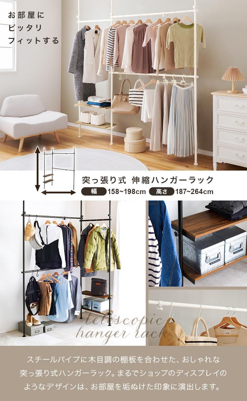 【大容量な伸縮式ハンガーラック】幅は最大198cmまで広がるので、私服はもちろん、学校の制服や仕事服など幅広い衣服収納に。S字フック5個付きなので、バッグや帽子など衣服以外も吊るせます。木目調のおしゃれな棚板には畳んだ洋服や、小物収納の置き場所にも。