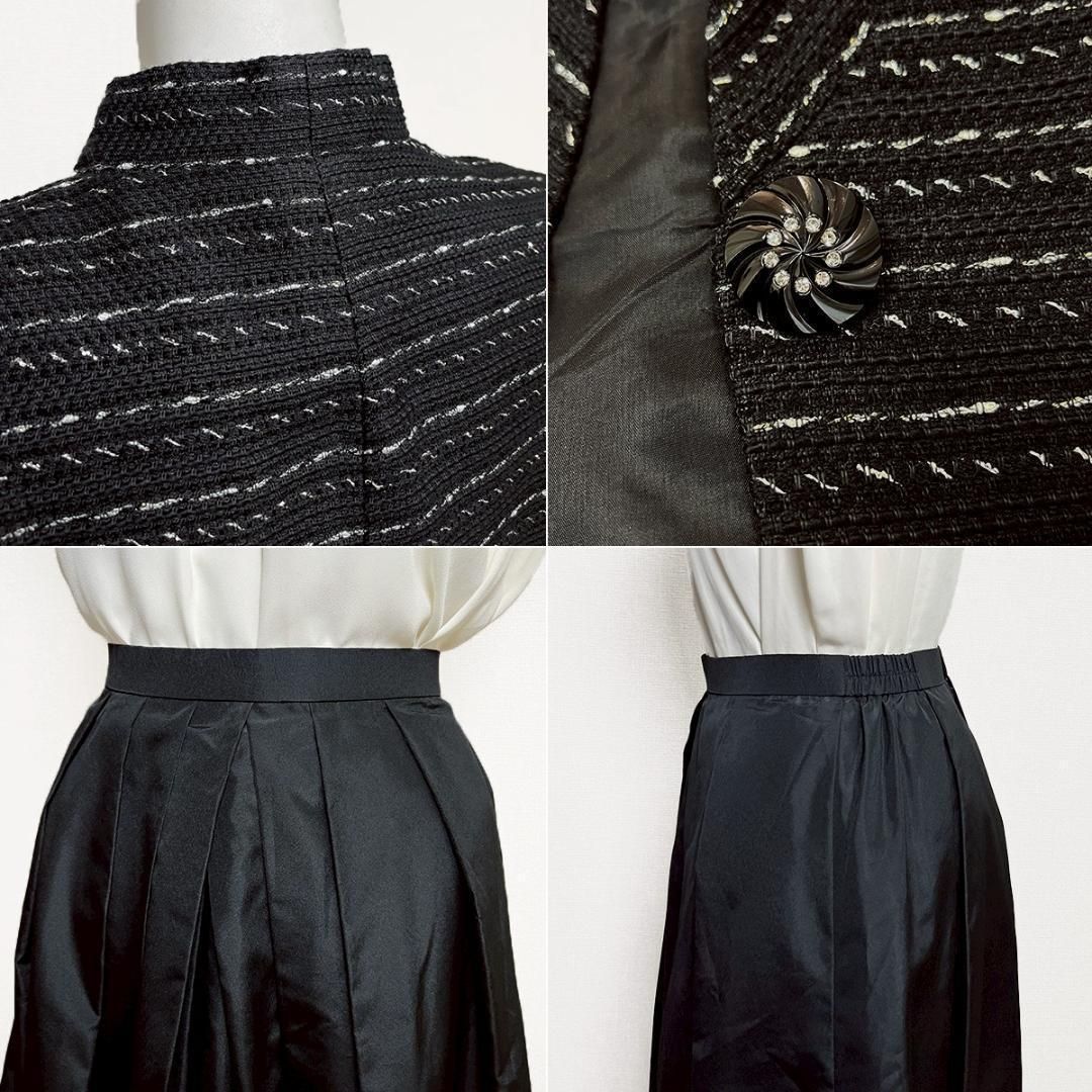 ブラックが基調のツイードのジャケット。銀糸の織模様と固い質感のフリルカラーがエレガントとシャープな印象も与えます。滑らかなサテンの胸当てを付ければ、よりシックな着こなしに、インナーを選んで雰囲気を変えた着回しもできます。ボトムは美しい光沢感のタフタのスカート。タックデザインの広がるフレアがドレッシーなシルエットをつくります。特別な日の1着にお勧めです。
