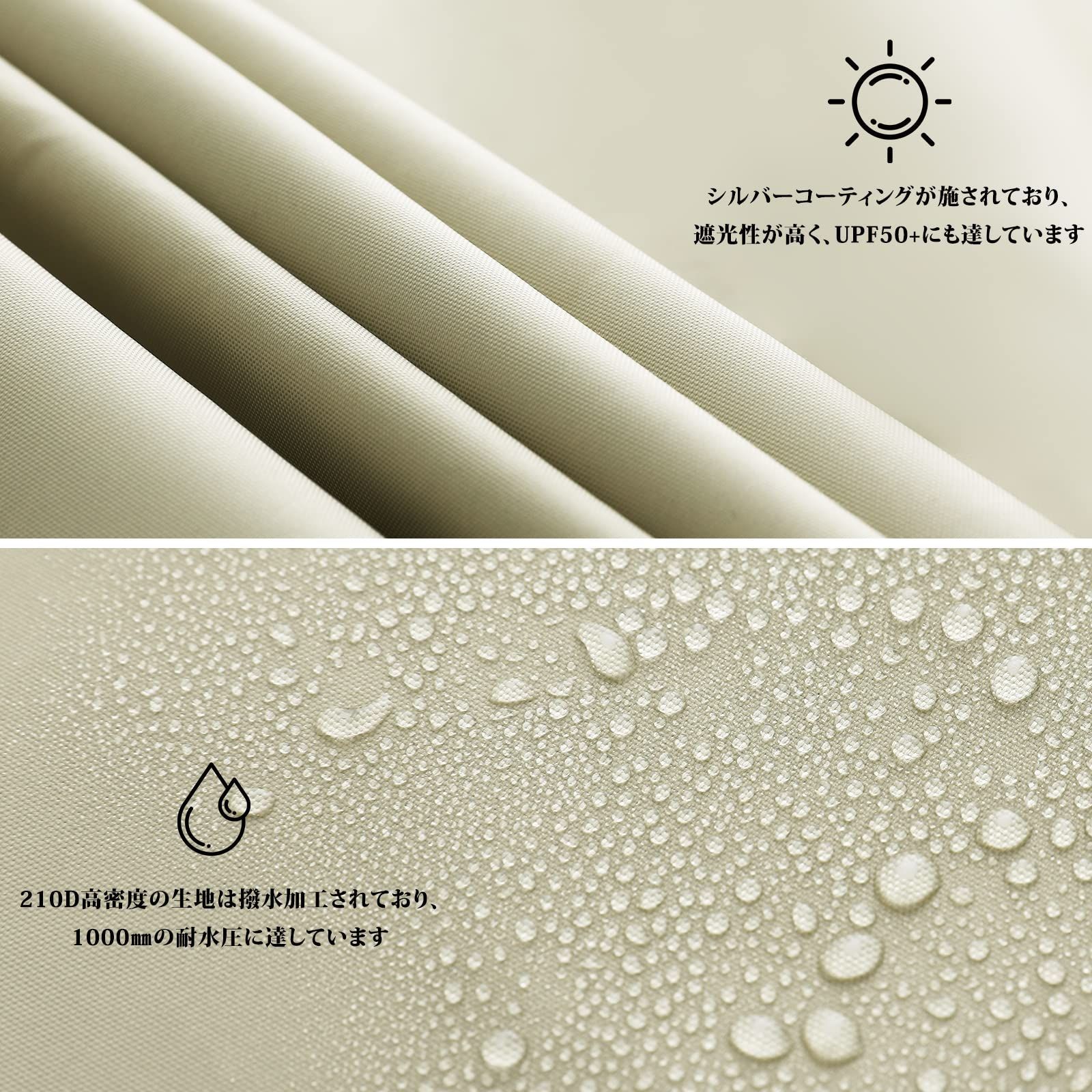 ?優れた防水性とUVカット:厚めの生地は1000㎜以上の耐水圧に達しており、大抵の風雨なら大丈夫です!UPF50+で99.9%の紫外線が遮られ、光からお肌を守ります。シルバーコーティングが施されており、遮光遮熱効果がさらに向上し、日差しを気にせずに自然を楽しめます。補強コーナーが施されており、破りにくく丈夫な作り、耐久性が抜群!あらゆる場合に対応できます。ばね仕掛けのスチールポールは粉体塗装されたので、組立簡単はもちろん、防錆性も優れています。