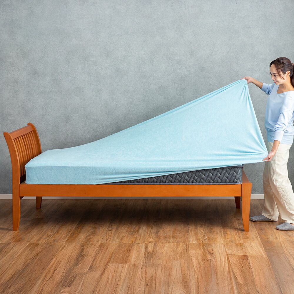吸水性に優れた綿100%(パイル部)のやわらかタオル地シーツです。タテにもヨコにもグーンと伸びるストレッチ素材と、全周ゴム入りで、マットレスにシワなくピタッとフィット。着脱も簡単で、お洗濯のたびにかかる手間を軽減します。やわらかな肌触りで、汗ばむ季節でもさらっと快適。一年中お使いいただける、心地よいシーツです。