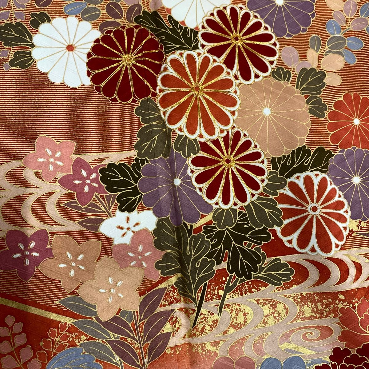 振袖 身丈160 cm 裄丈63 S 袷 菊 流水 金糸 金彩 茜色 正絹 秀品