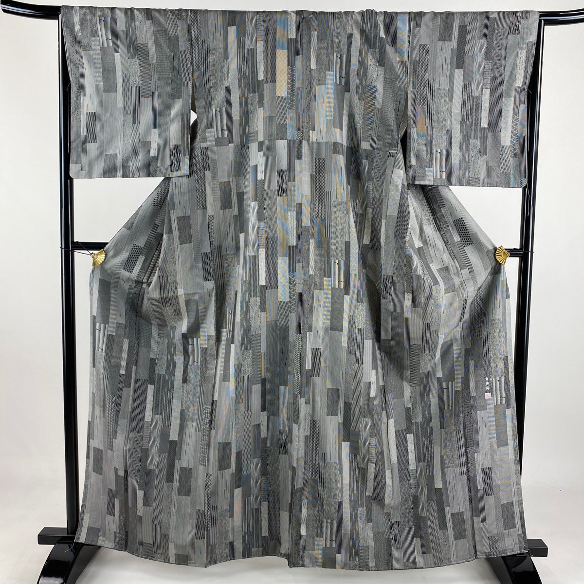 小紋 身丈163 cm 裄丈66 M 袷 紬地 落款 縦縞 よろけ縞 黒灰 正絹