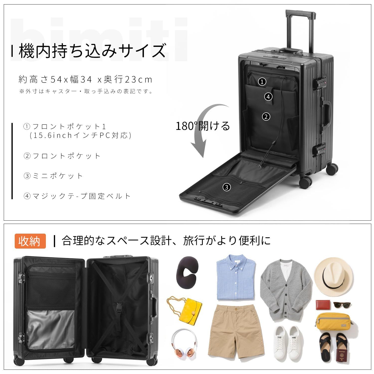 bimiti スーツケース 機内持ち込み フロントオープン キャリーケース 携帯スタンド USBポート付き カップホルダー付き 隠しフック機能 超軽量 静音ダブルキャスター 360度回転 耐衝撃 アルミフレーム ピュアPC材質 TSAロック Sサイ