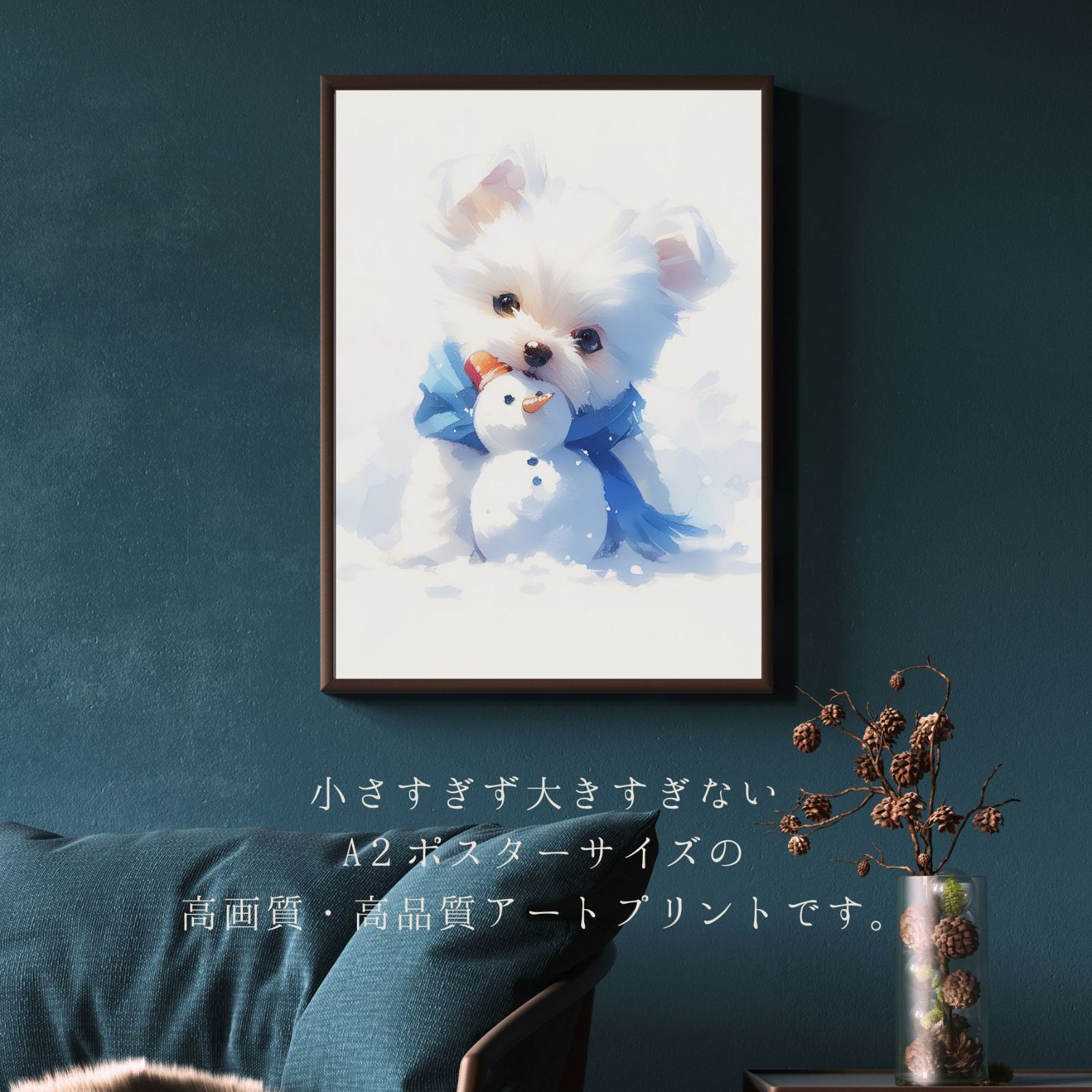 【雪犬戯舞】は、真っ白な雪原で雪だるまと遊ぶ、マルチーズ犬が可愛すぎるアートポスター作品です。